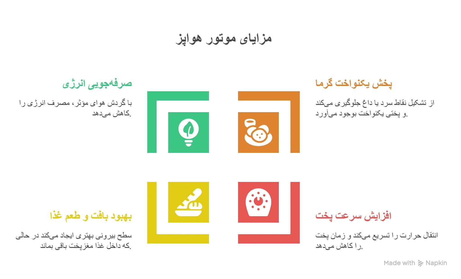 جریان هوا باعث میشود رطوبت اضافی از سطح غذا دور شود و سطح بیرونی بهتری ایجاد شود (طلایی، ترد) در حالی که داخل غذا مغزپخت باقی بماند. - صرفهجویی انرژی