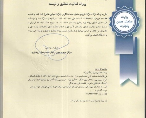 خوشحالیم که به اطلاع شما برسانیم که شرکت ما با کسب پروانه فعالیت تحقیق و توسعه از وزارت صنعت، معدن و تجارت، گامی مهم در جهت ارتقای سطح تحقیقاتی و فناوری خود برداشته است. این مجوز به ما این امکان را میدهد تا با تکیه بر استانداردهای ملی و بین…